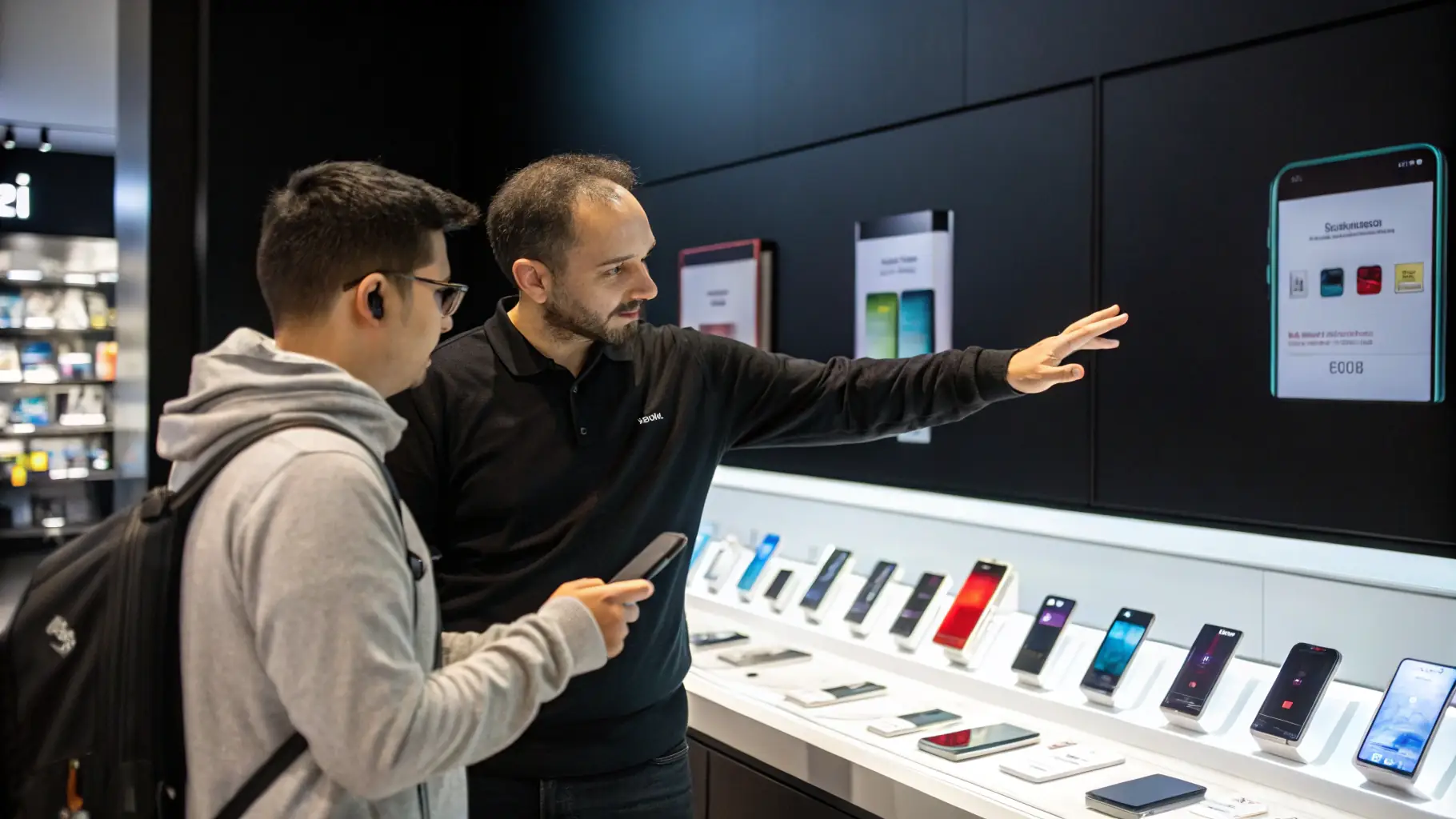 A modern cell phone retail store with a variety of smartphones on display, showcasing a bustling and successful business environment.