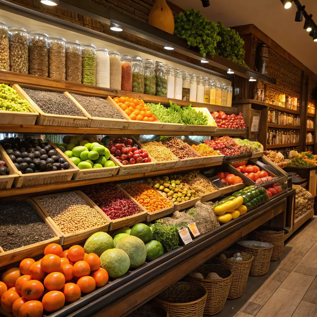 A brightly lit, modern grocery store aisle filled with fresh produce, showcasing a variety of colorful fruits and vegetables, symbolizing the potential for growth and success with the right funding.