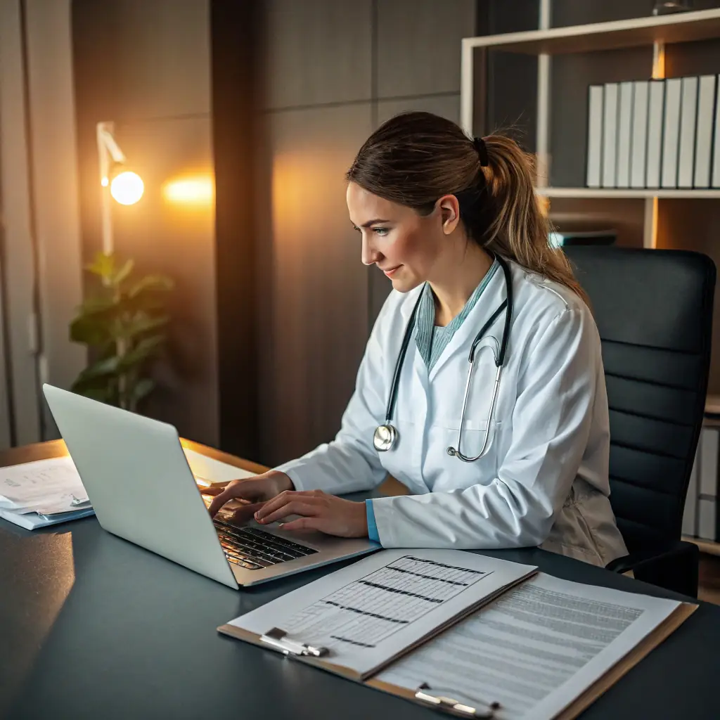 A doctor reviewing financial documents in a well-lit office, representing financial expertise and trust.